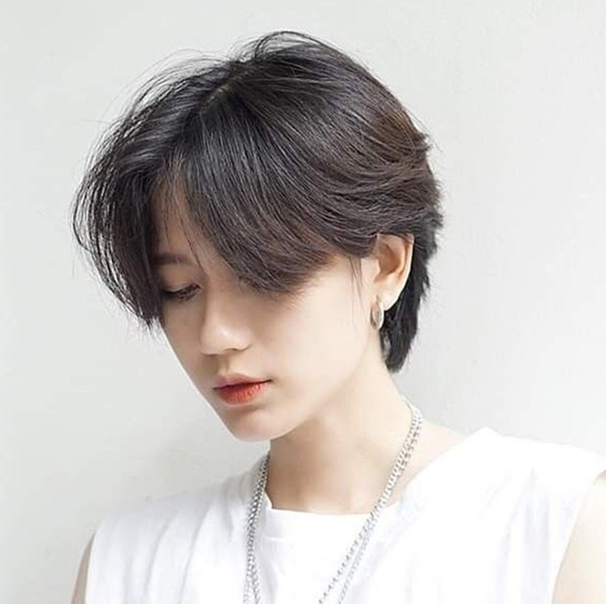 Kiểu tóc tomboy kết hợp mái xéo dài che một phần mặt, tạo hiệu ứng khuôn mặt thon gọn. Đây là kiểu tóc phù hợp với những bạn muốn dung hòa giữa phong cách cá tính và dịu dàng.